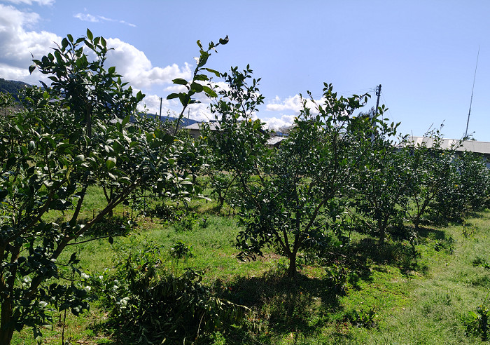 畑には、植え付けたばかりの苗木から、数年を経た若木、長年栽培されてきた成木まで、異なる成長段階の木が存在している。