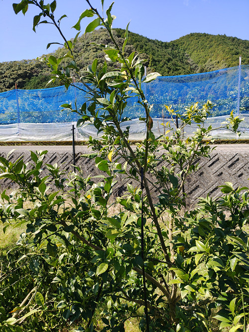 ゆずは成長に伴い枝が上方向へ伸びやすく、管理を行わなければ樹高が高くなり、収穫や作業効率に影響が出る。そのため、枝を横に誘引することで高さや樹形を調整する作業が行われている。