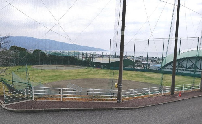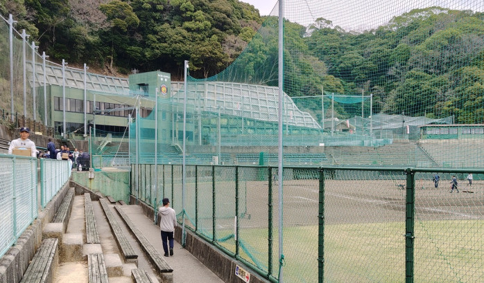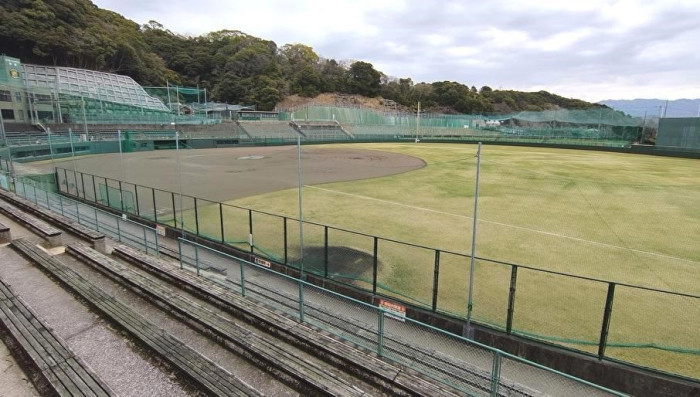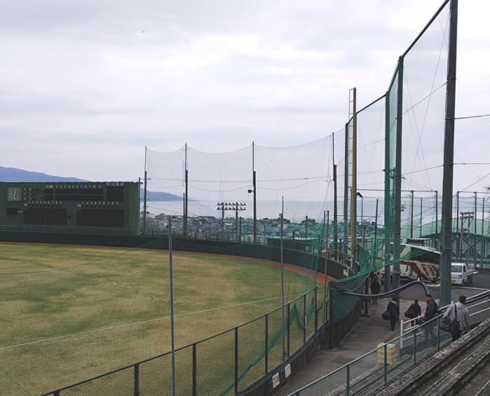 球場の上部からは、背後に町並みと海が見える位置関係にあり、施設としての立地も特徴的である。観客席やグラウンドは整備が行き届いており、日常的な管理が継続されていることがうかがえる。