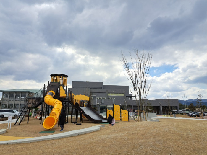 鞍手町中央公民館の隣にできた新しい遊び場です。周辺には鞍手町文化体育総合施設や役場の新庁舎などが集まっていて、「鞍手町文化体育総合施設」として一帯がきれいに整備されていました。