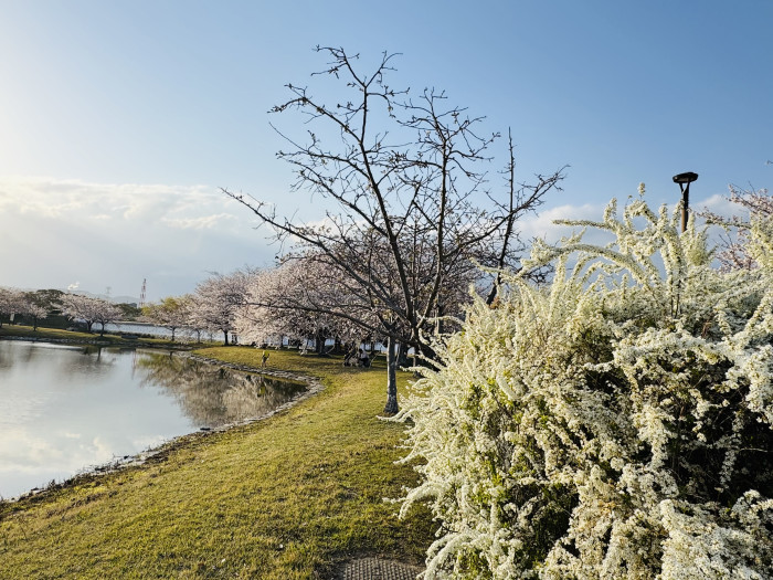 広い敷地、また池もある管理された広場には見事なソメイヨシノの光景が広がります。