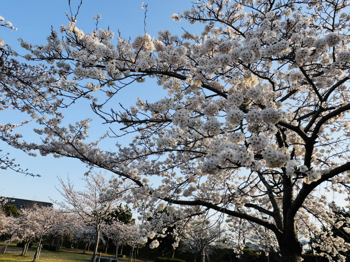 そんな赤穂の桜の中で、筆者おすすめなのが、城南緑地体育館を過ぎたところにある芝生広場です。