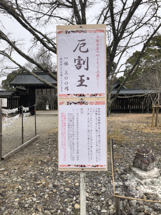 ご祭神の後醍醐天皇は、困難に立ち向かってさまざまなことを成し遂げたそう。その不撓不屈の精神にならって厄を落とす「厄割玉」。