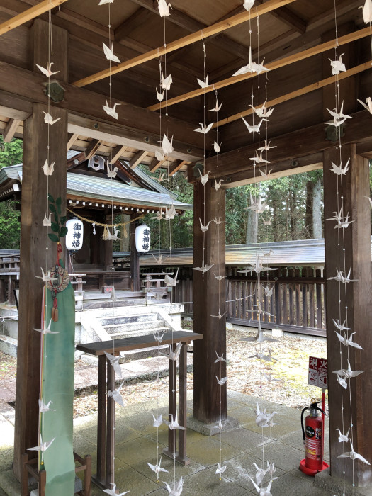 社殿の折鶴が風に揺れてきれいでした。桜色の和紙で折った「花咲く祈りのさくら鶴」だそう。