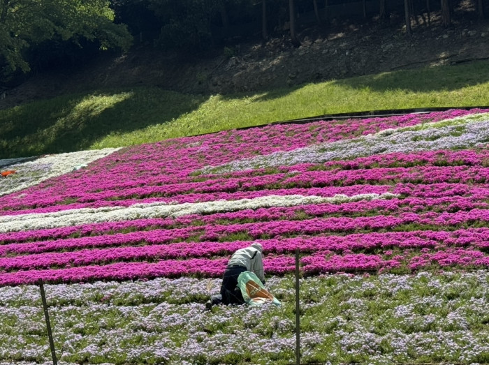 入り口から徒歩約10分で目の前に芝桜が広がります。芝桜とは芝のように茎が地面を覆うように横に広がり、桜のような花を咲かせるところから、芝桜の名がついたそうです。