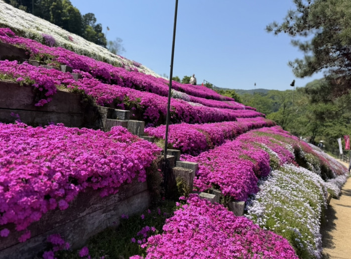 階段を上がっていくと、山の斜面は一面の色とりどりの芝桜。思わずため息とともに何枚も写真を撮りたくなりますよね。