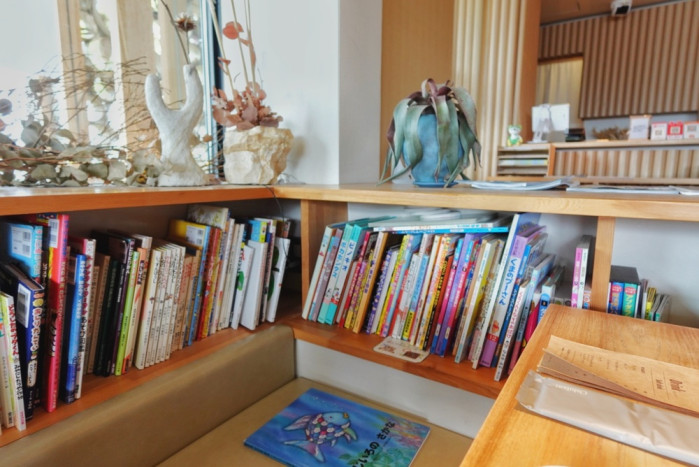 このお店の魅力のひとつは、約4,000冊もの絵本や古本がそろう空間。店内の本棚は食事席のすぐそばにあり、子どもも大人も気軽に本を手に取ることができます。