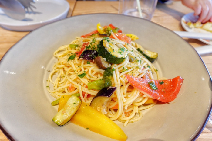 それぞれ違うパスタを選び、夫は「富山農家のオルトラーナ」。季節の野菜がたっぷり使われ、野菜の自然な甘みや旨みをじっくり味わえる一皿でした。