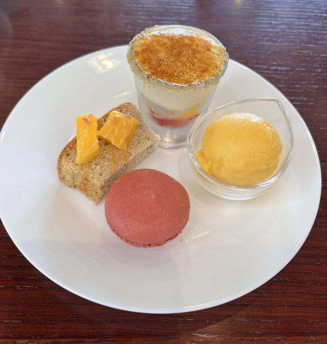 2段目は、奥から時計回りに、クリームブリュレ、マンゴーアイス、フランボワーズ(多分)のマカロン、紅茶のシフォンケーキマンゴー添え。