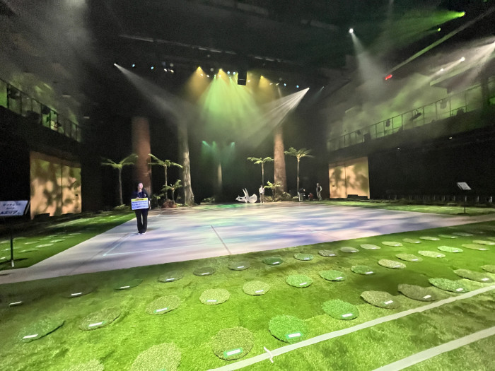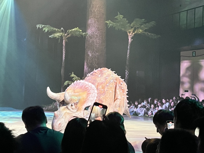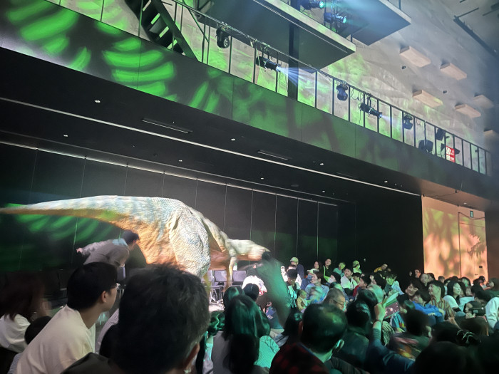 観客席は、恐竜が動き回るステージを囲むように人工芝に座る形に変更されていました。