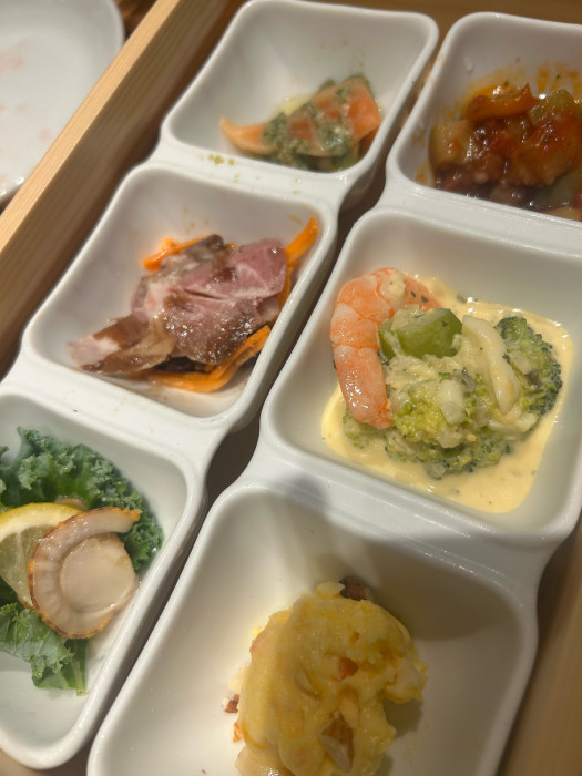 ドリンク・スープバーにメイン料理、おかわり自由のサラダとフォカッチャに加えて生ハムサラダ、デリ6種