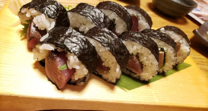 こちらは土佐巻きといって、生の鰹(焼いていないもの)と薬味を巻き寿司にしたものです。