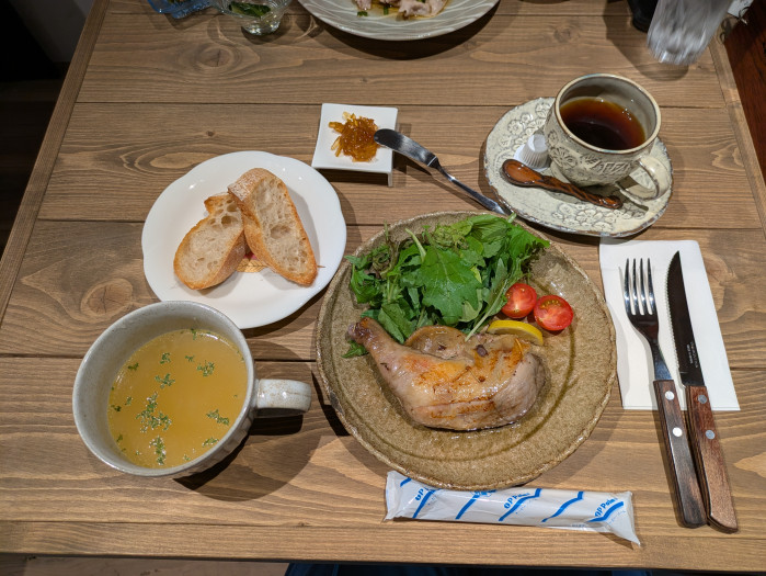ランチで選んだのは、「ハーブが香る鶏肉のコンフィ」。ジューシーで、付け合わせの野菜も新鮮そのもの。やさしい味わいのスープとともに、食べるほどに満足感が増す料理でした。