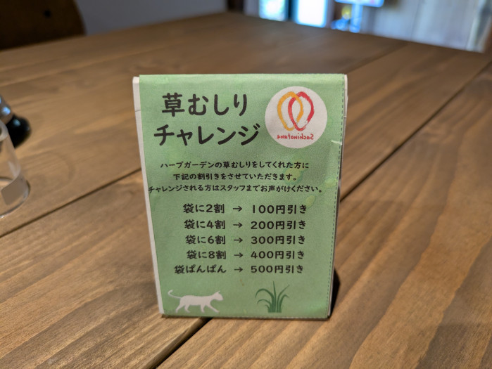 またこのカフェでは、庭の草取りを行うと料理の割引が受けられるユニークなサービスがあること。今回はそのサービスを知らずに訪れたので、次は草が伸びる季節に参加してみたいと思っています。