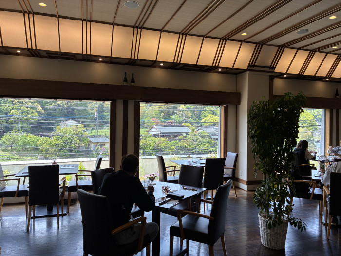 テーブル席を中心に、半個室部屋や奥には個室が。個室はテーブルと和室の2種類。今回は中央フロアに面した半個室部屋で食事をしました。大きな窓からは、木々や嘉瀬川も見えます。