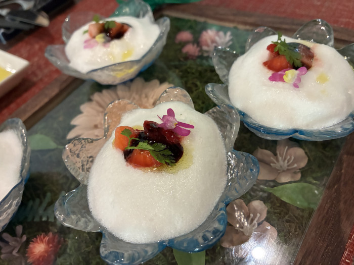 訪れたのは4月末。季節のコース料理は春メニューで、4種類の中から「KAEDEコース(8品)」(3,520円)を選びました。まずはこちらの前菜、いちごを使ったムース!ソースは塩味、甘酸っぱさが感じられ、しゅわっと溶けるようなくちどけです。