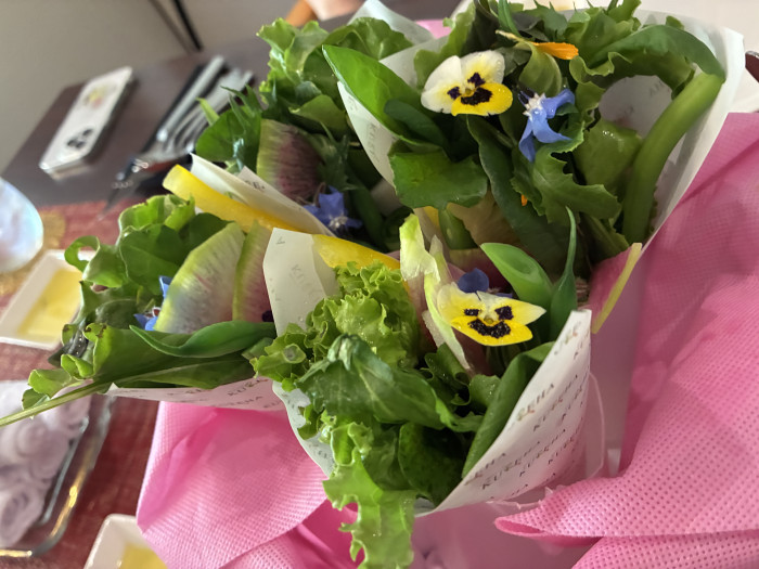 KUREHAの前菜としてお馴染みの、ブーケサラダ。このお花も全て食べられます。味付けは最小限で、それぞれのみずみずしさや食感をしっかりと味わえます。その後、自家製オリーブオイルをつけていただくいちごのパンや、深みのある豆スープも。