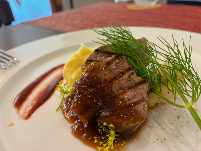 メインは佐賀県産豚ヒレ肉のステーキ!肉厚だけど、柔らかい。豚肉ってこんな主役級のステーキになるんだ…!と感心するほど。ちなみに、肉料理や鴨肉や特選黒毛和牛、A5佐賀牛からも選べる(別途料金追加)ほか、お魚メニューもチョイスできます。