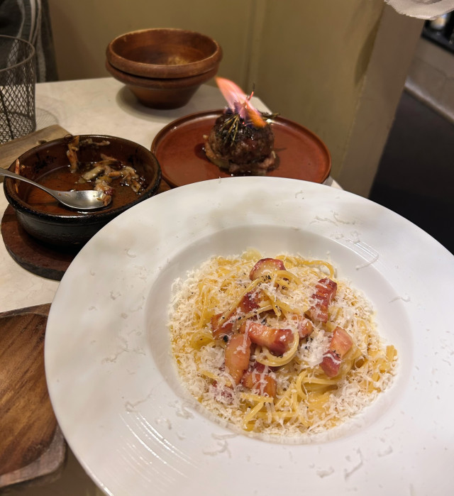カルボナーラは目の前でチーズを沢山削って頂けてチーズが好きな私と友人にはとても幸せな一品でした。濃厚なパスタなので、食べ終わった時の満足感が良かったです。