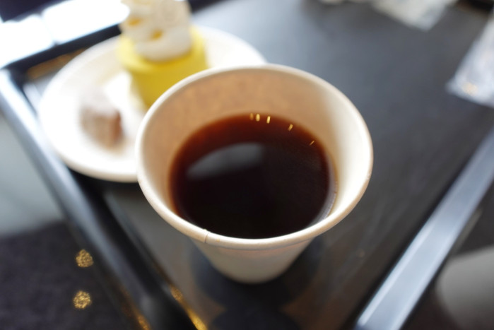 当初はテイクアウトのみの再開だったようですが、現在はイートインスペースも利用可能に。カフェメニューは縮小されており、ドリンクの販売は行われていませんが、無料でいただけるレモン水とコーヒーがセルフで用意されていて、ほっと一息つける嬉しいサービスです。