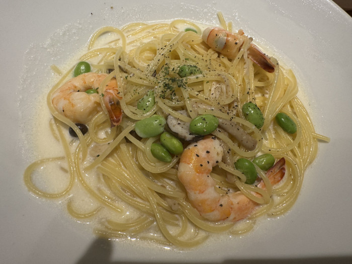 「えびと枝豆のクリームソースパスタ」。