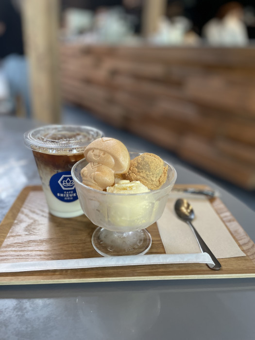 高野山の銘菓“「松栄堂」のかるかや餅”をトッピングした、高野山銘菓かるかや餅とカフェラテを注文。