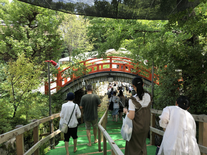 境内の御手洗(みたらし)池で行われるみたらし祭。ふだんは入ることのできない、禊で使われる池に足を浸して、無病息災を祈る神聖な行事です。