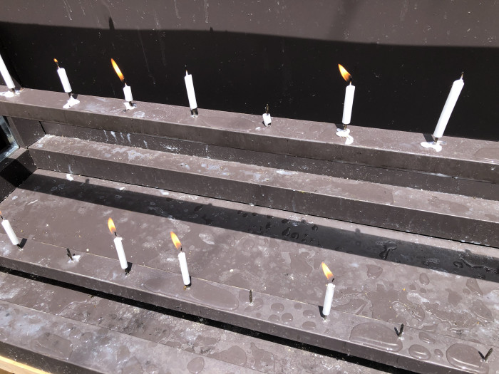 池の中で献灯します。昨年は強風ですべての火が消えていましたが、今年はしっかり灯っていました。