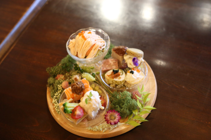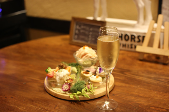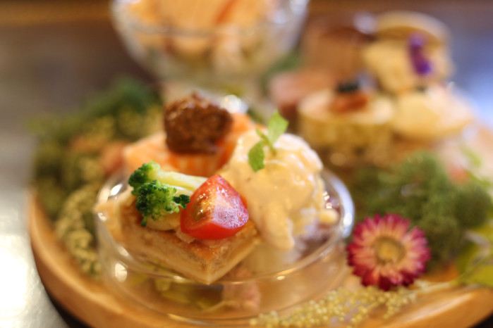 一見すると、まるでアフタヌーンティーやスイーツビュッフェのよう。でもよく見ると、鶏レバーのプリンや、にんじんのミルフィーユ、パテ・ド・カンパーニュといった本格的なおつまみの数々が並んでいます。