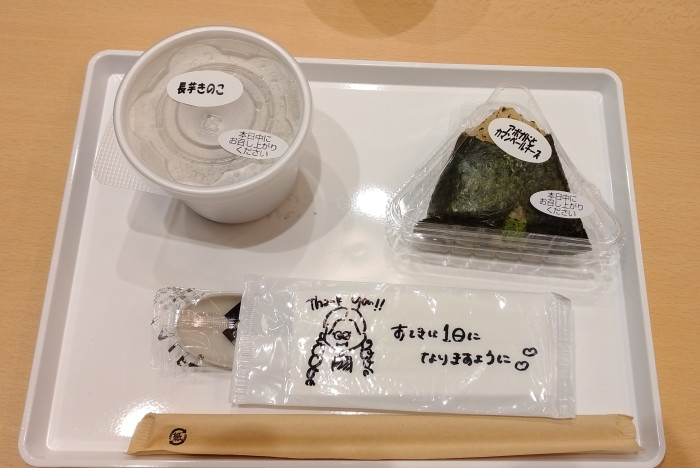 私が注文したのは「カマンベールチーズとアボカドおにぎり」と「長いもときのこのスープ」。