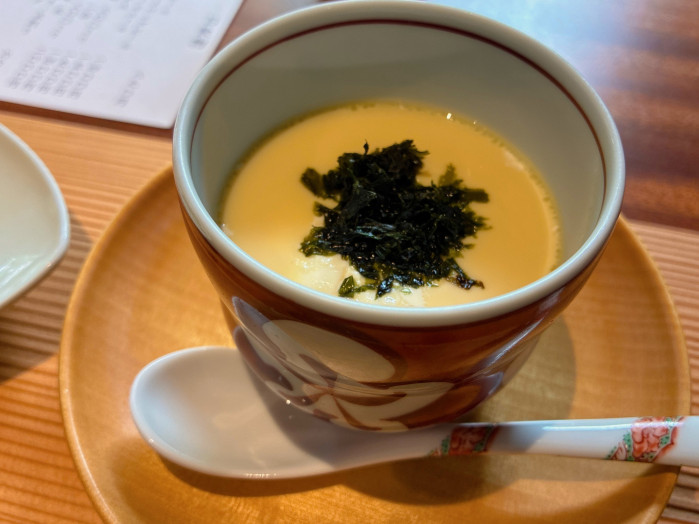 「クリームチーズ茶碗蒸し 有明香味干しのせ」。佐賀海苔をそのまま乾燥・焙煎したものがトッピングされています。中にはたっぷりのクリームチーズ。ぷるんとコクのある茶碗蒸しと酸味のあるミルキー感、相性抜群!