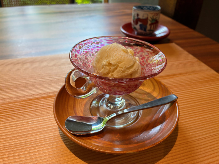 こちらも追加注文でアイスクリーム(330円)を。若女将の手作り。最初は香ばしさを感じ、ナッツ?マカダミア系かな?と思っていたら、正解は…そば!そばとミルクって合うんだ…そういえば、ほうじ茶ラテとかあるもんなぁ。他ではなかなか食べられない味、もったいないくらい美味しい…。