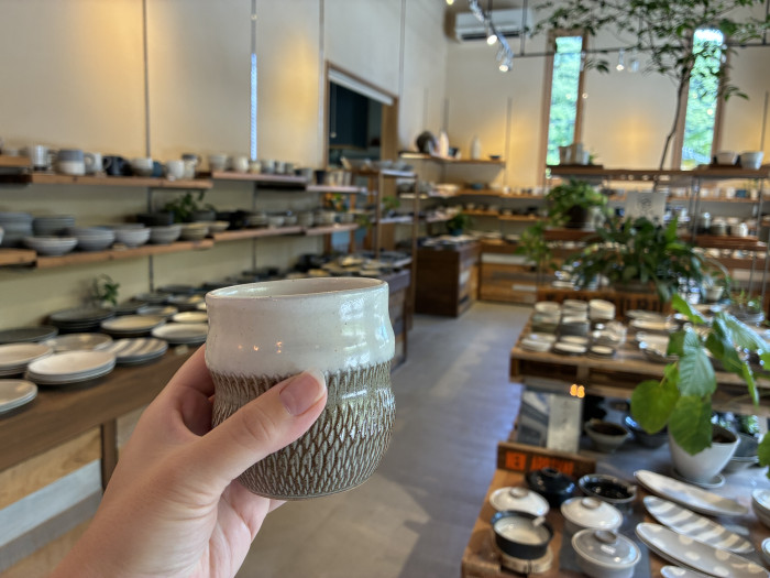 湯飲みのひとめぼれ!さらに、宿泊先で、湯飲みで飲んだコーヒーがとっても印象的で…これは取り入れたい!と、さっそく真似っこすることに。マグもたくさんいいものがあって迷いましたが、新たな器の取り入れ方に挑戦。くぼみがあって手に馴染む、優しい柄が入った湯飲みは1,800円でした。そのほか、メイン皿も2枚購入。手にとるとどれも欲しくなるのですが…一旦、冷静に3つを購入しました。