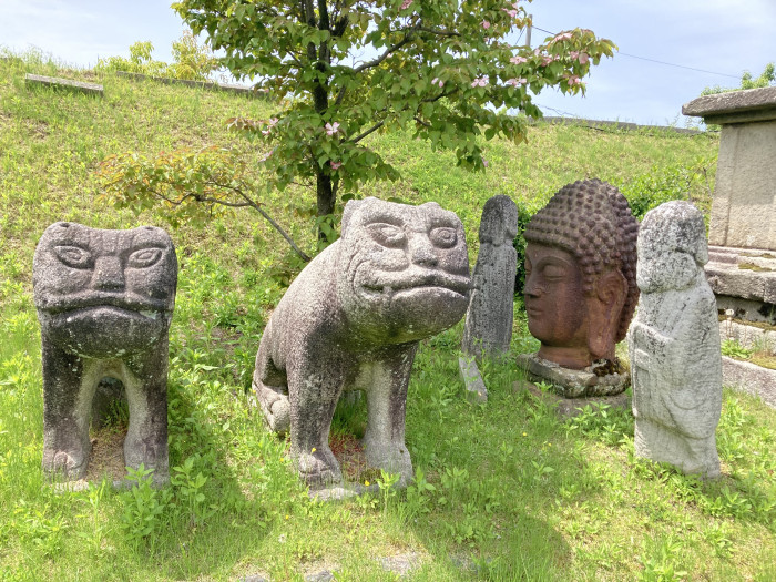 入り口でどっしりと構える2体の石像は虎のように見えます。