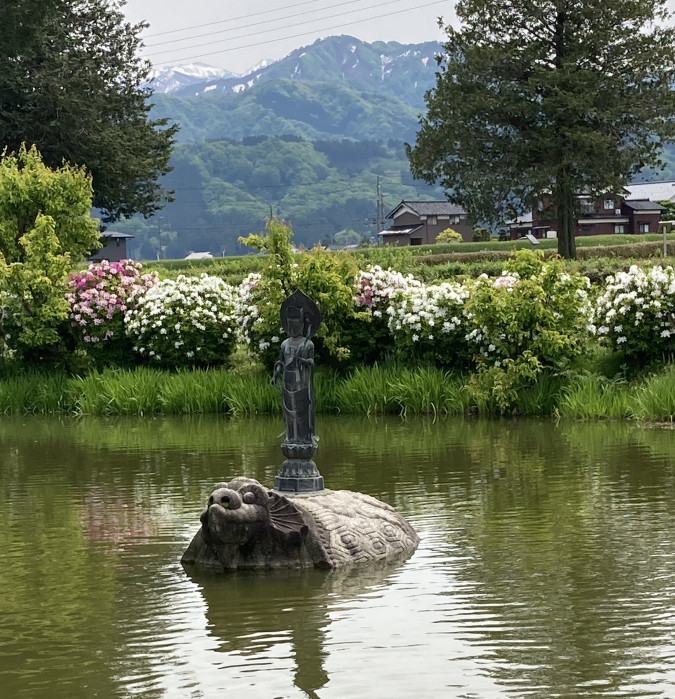 池から顔を出す亀。その背に乗っているのは観音様でしょうか?