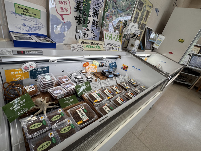 こちらはすぐ側にある漁港で水揚げされたとれたて活きのいい地魚や、地元の名産須磨海苔、いかなごの釘煮、しらすなどの加工品を豊富に揃え販売していて、地元の海の恵みをお土産にしたい方にピッタリの場所です。