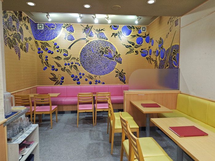 可愛いフルーツが描かれた壁が素敵なパステル調の店内に自然と気分が上がります。