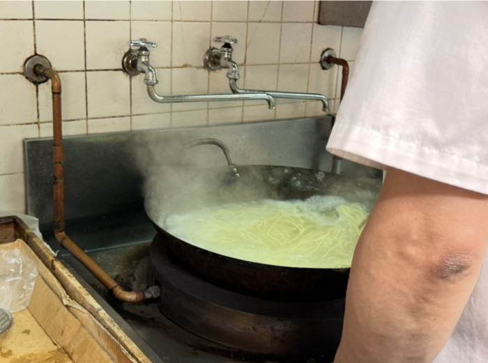 ここの麺、通常よく見る麺の茹で方とは違い、大きな中華鍋?で一気にしかも結構な時間茹でます。