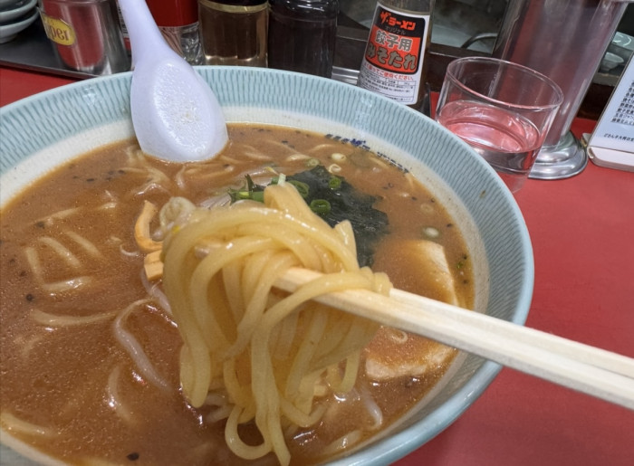 もちもちしてしっかりした麺ですが、味噌スープによく合う。何よりこの麺のつるんとした滑らかな食感がとってもおいしくてこれはクセになる!