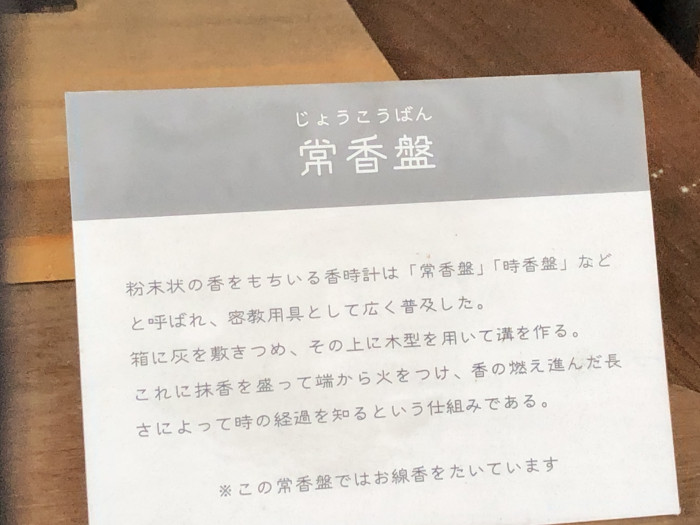 お香が燃え進むことで時の経過を知るとのこと。とても素敵な仕組みですね。