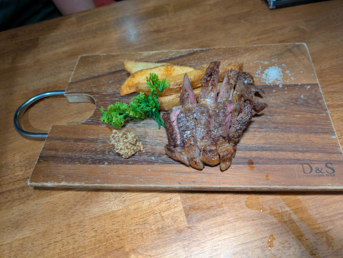 お店の自慢は、全国で1ヶ月にわずか3頭しか出回らない山口県産・幻の無角和牛。赤身ながら旨味がぎゅっと凝縮され、専用の熟成庫でじっくり寝かせることでさらに柔らかく濃厚な味わいに。炭火でレアに仕上げたステーキやグリル焼きで、塩や自家製ソースのシンプルな味付けです。