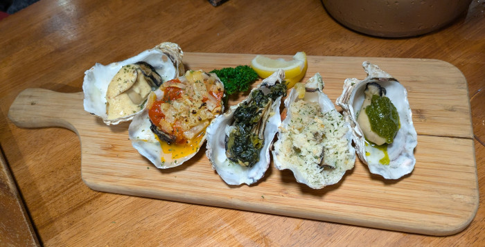 さらに、広島産の焼き牡蠣5種盛り合わせも見逃せません。ディジョン粒マスタードマヨ、トマトとモッツァレラチーズ、ほうれん草とガーリック、エスカルゴバターと香草パン粉、バジルと松の実のジェノベーゼの5種類を食べ比べでき、3種類盛り合わせも選べます。手づかみで楽しむ豪快なシーフードや、ガーリックオイルで煮込んだ魚介のアヒージョも人気です。