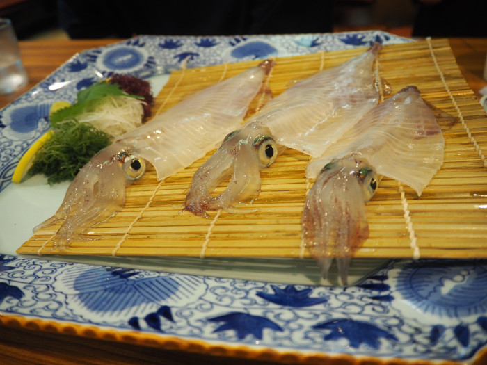 新鮮なイカのお刺身(写真は二人分)は、お皿の上でまだ動いています…!