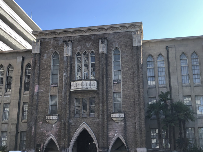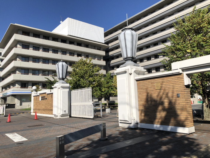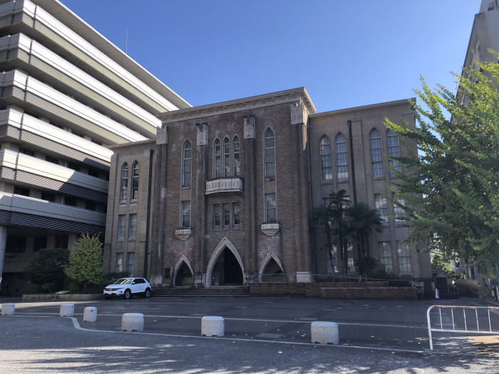 河原町通り沿いに並ぶ、京都府立医大河原町キャンパスと府立医大病院。いずれも近代的な建物ですが、敷地内に一つだけレトロな建築があります。