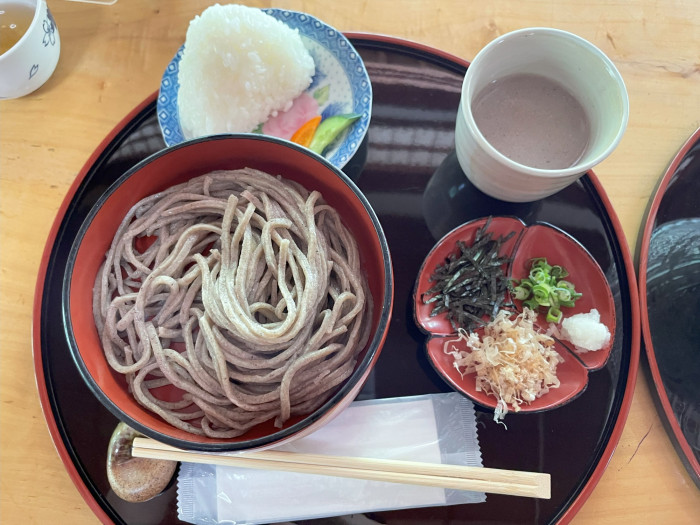 こちらは割り子そば3段とお目当ての仁田米で作ったおにぎりです。