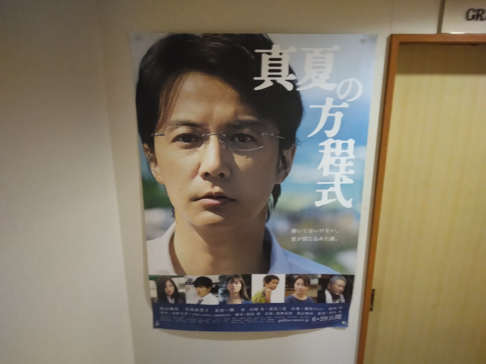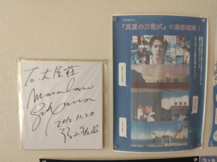 入り口の受付の隣りには、映画の紹介と共に、福山雅治直筆のサインを記した色紙が飾られていた。旅館の名も記されている。