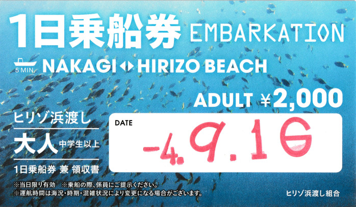 このチケットがあれば、港とビーチを自由に何度も往復できる。理由は単純で、ビーチにはトイレがないからである。例え小であれ、便意を催したら逐一港のトイレまで戻らなければならないのが、海水を汚さずに美しい海を後世へ継承しようと地元の方々が考案した、ヒリゾ浜の厳格なルールである。With this ticket, you can go back and forth between the port and the beach as