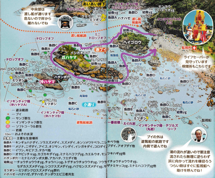 魚類をはじめ、イソギンチャクなどが写真付きでほぼ網羅されている。シュノーケリングの後に、あの魚は何だったのだろうと思ったら、休憩がてらパンフレットを開いてみるとよい。あ!これ、これ!と、名前が分かるので、生物への親近感が募るのは間違いない。