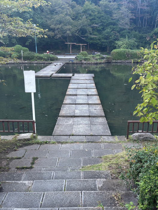 その少し先には大きな池があり、石の足場を渡って反対側まで行けるようになっています。水辺に映る木々もきれいで、プチ冒険気分を味わえます!