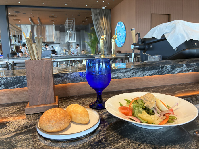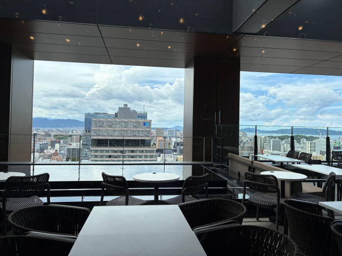 カウンター後ろのガラス越しにはテラス席。19階からの景色を一望できます。秋になるとちょうど良い気候になりそう。テーブル席側は、海が見えました。